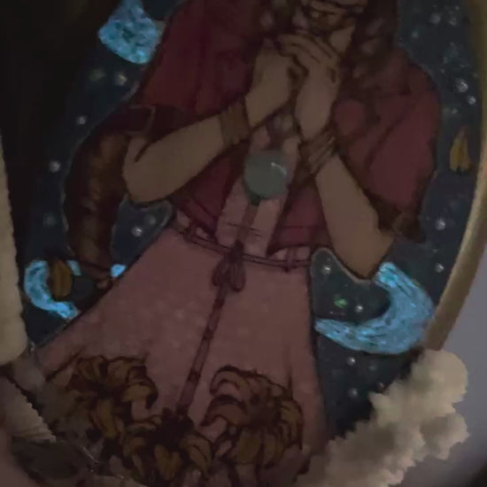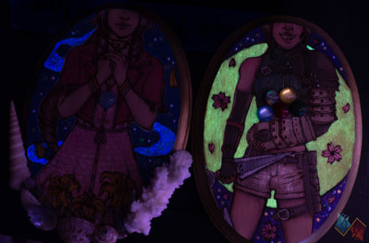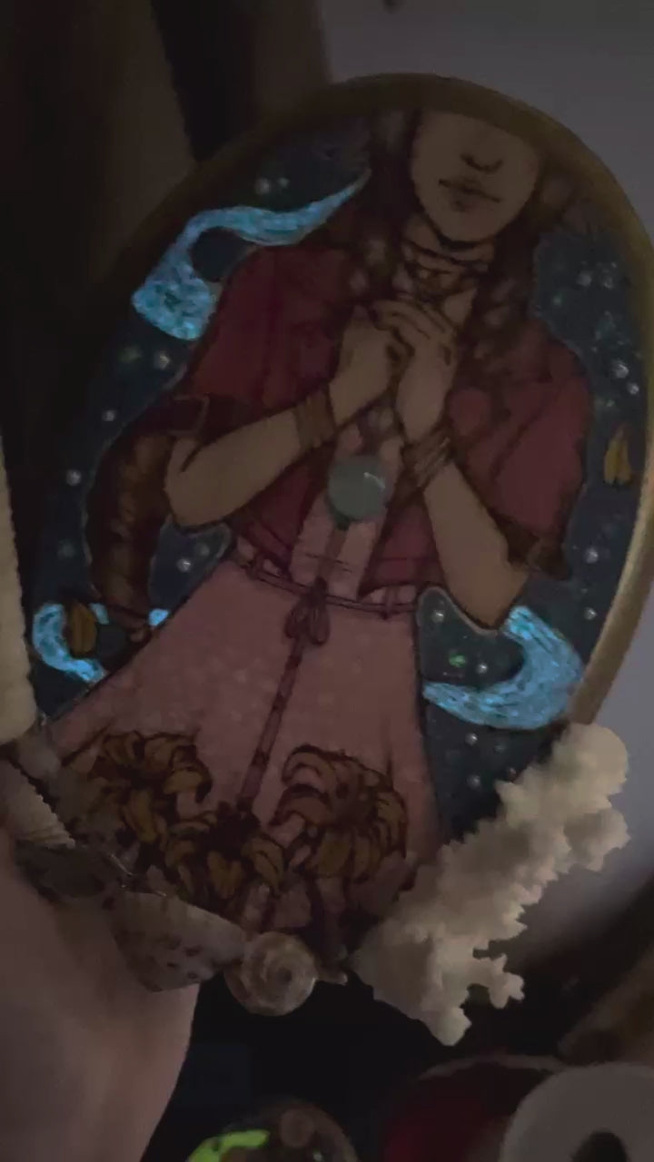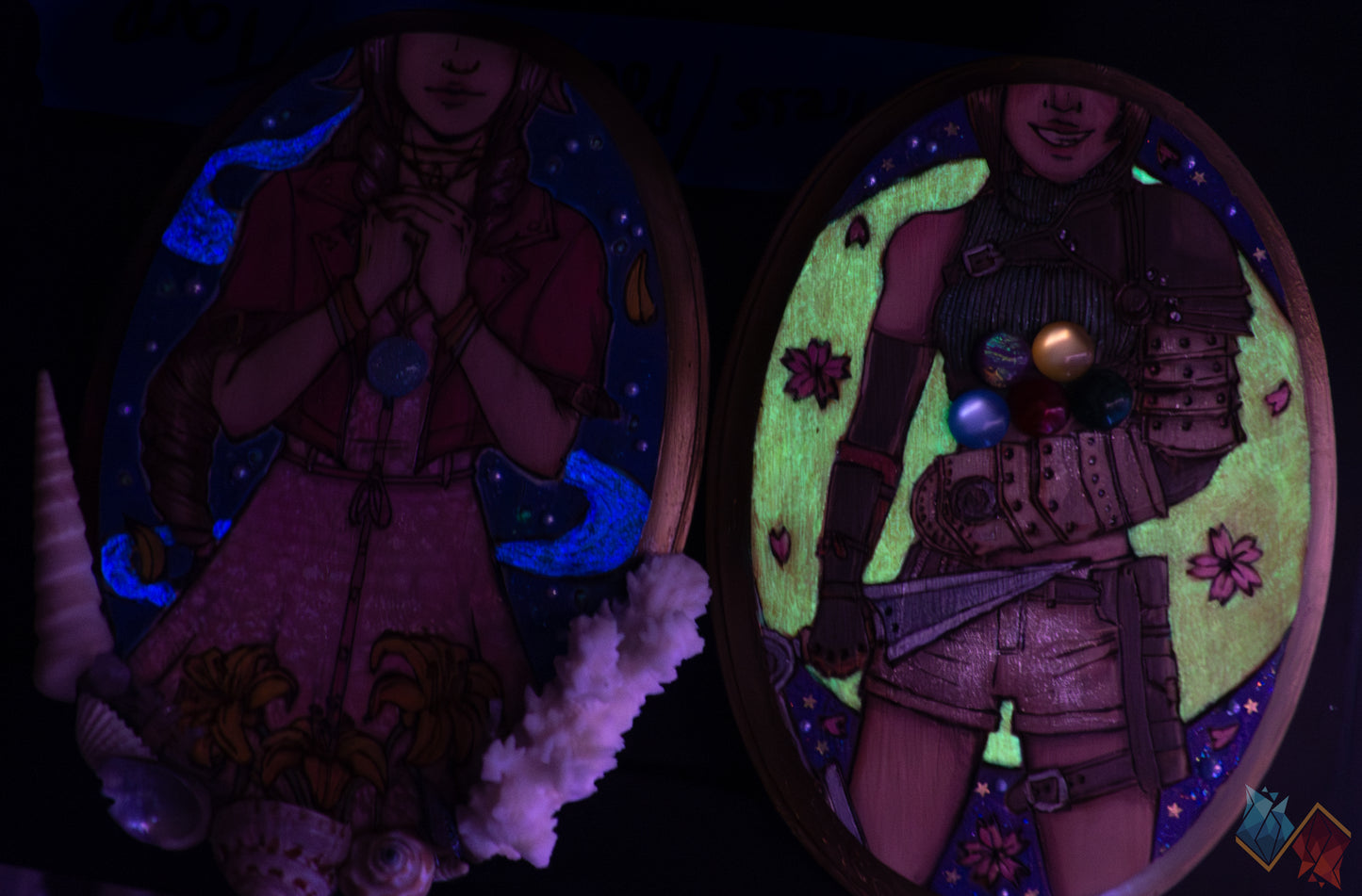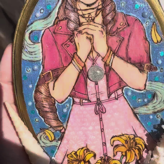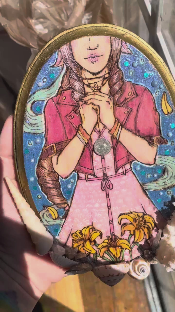 A mixed media woodburn piece of Aerith praying at the Forgotten City.