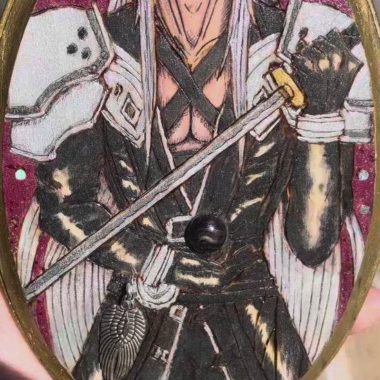 A mixed media woodburn piece of Sephiroth with the black materia.